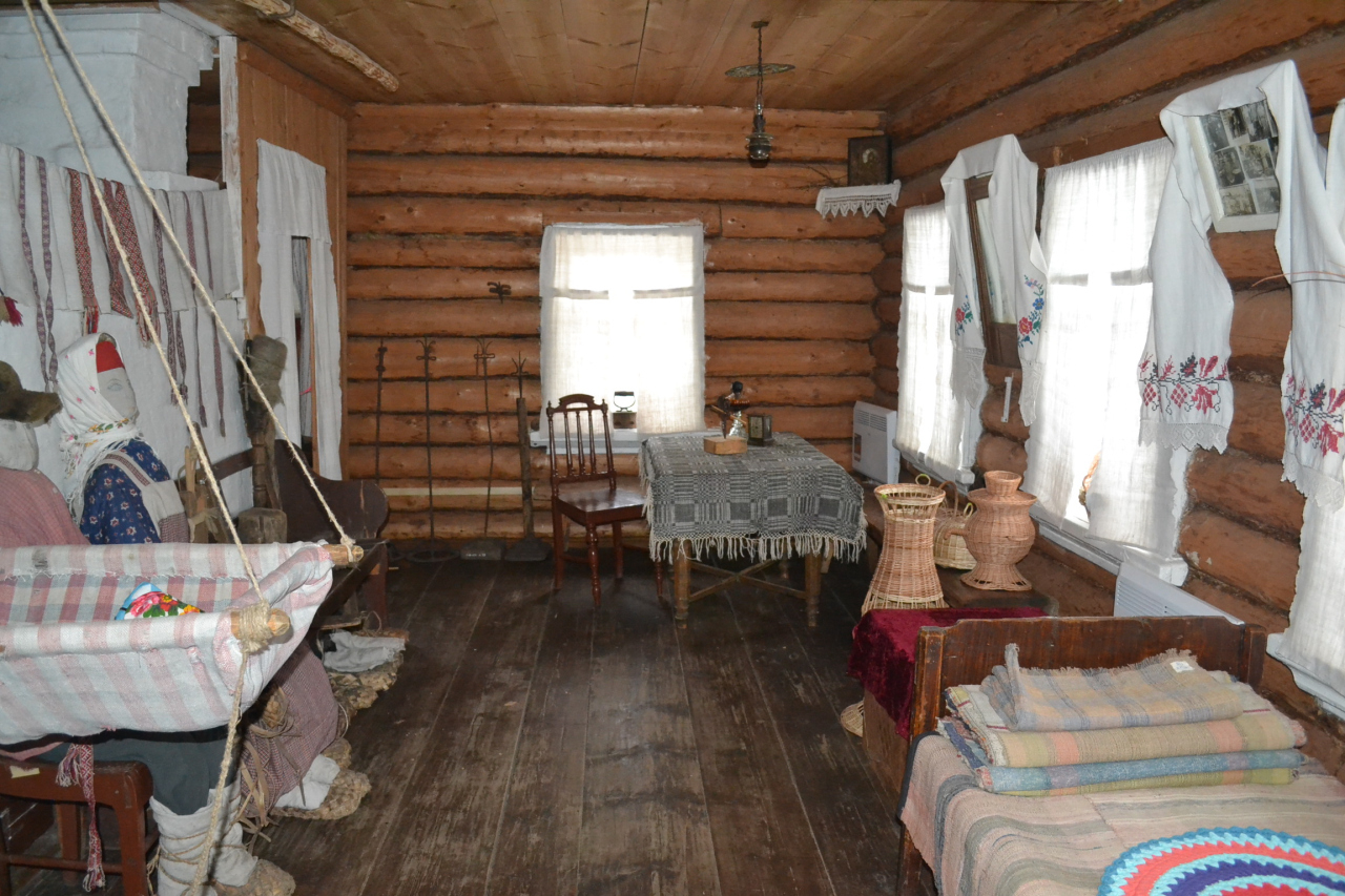 История представлена через предметы крестьянского быта, орудия труда, одежду и другие подлинные экспонаты.